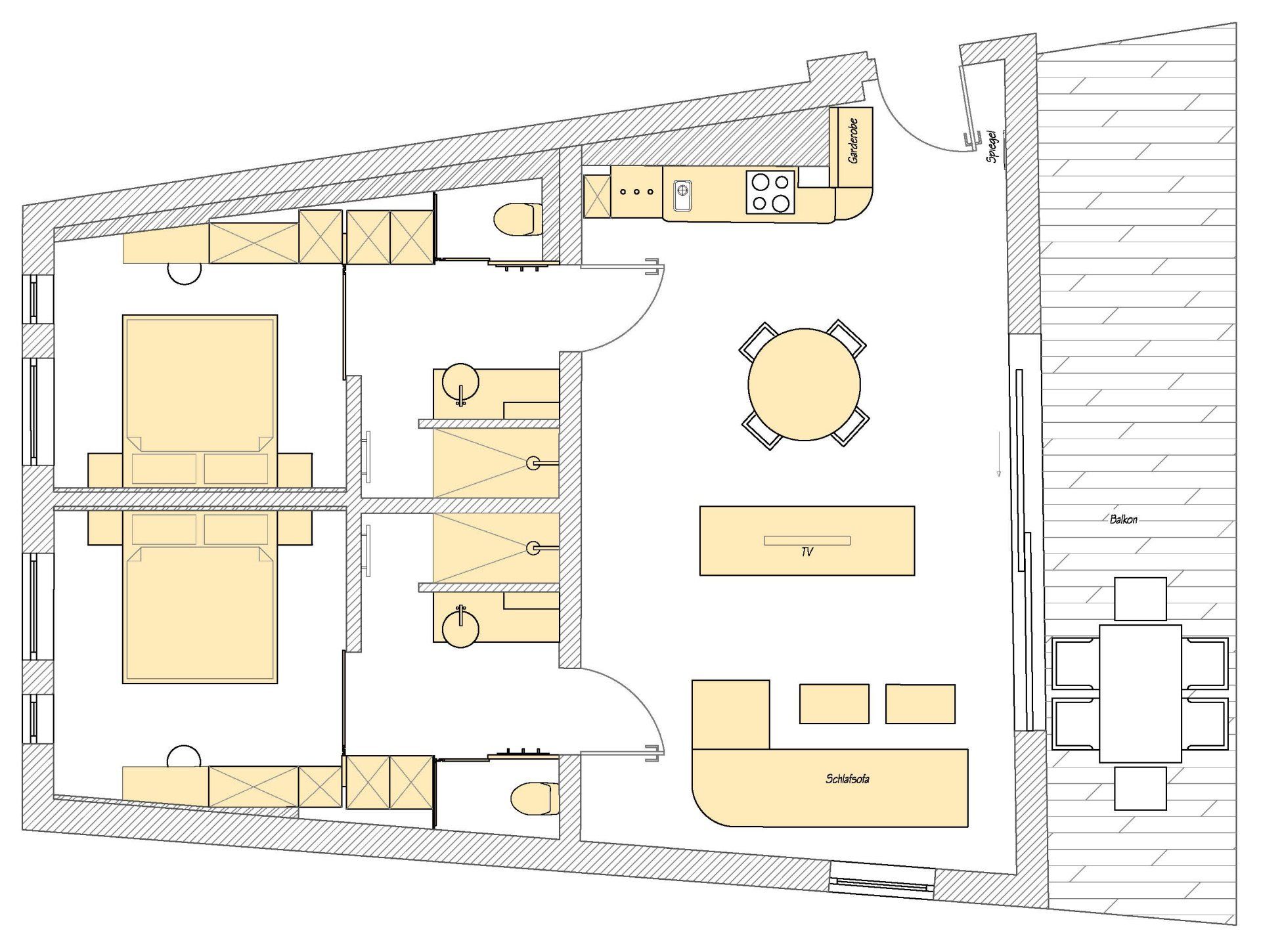 75 m² große Suite mit kombiniertem Wohn- und Essbereich mit offener Küche sowie zwei Schlafbereichen